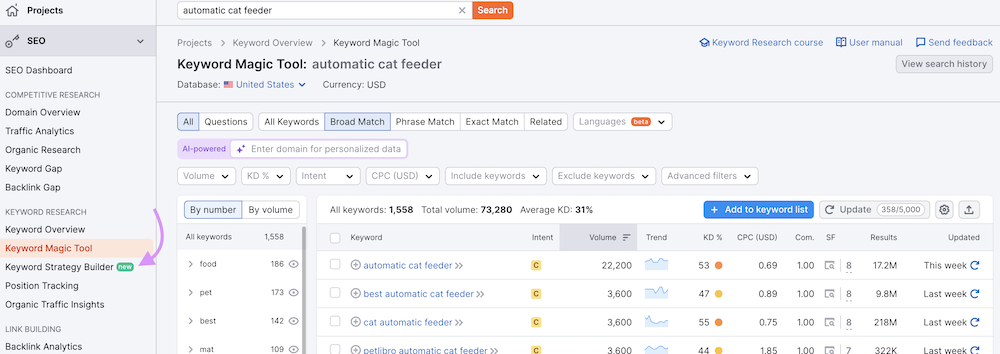 You can then export the keyword list from the Keyword Strategy Builder. Just click “Keyword Strategy Builder” from the left navigation bar.