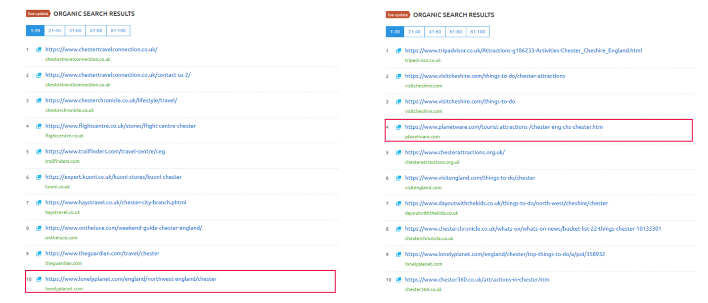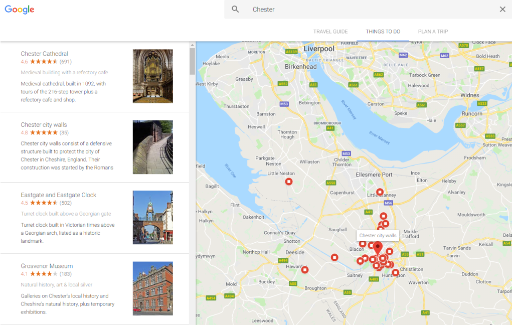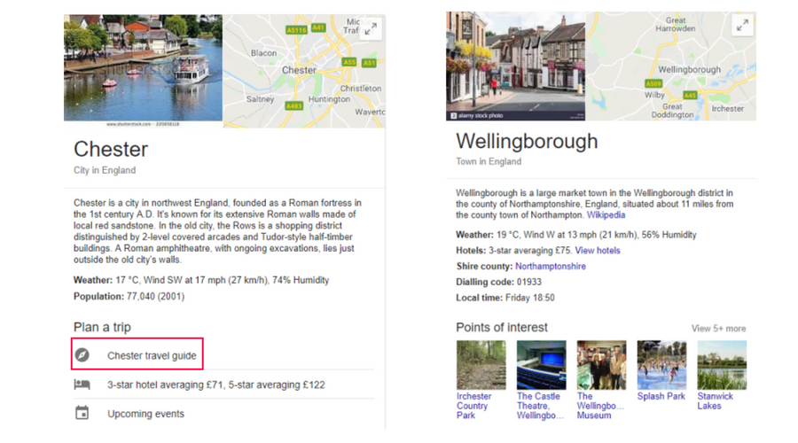 The immediate thing you will notice in the travel articles is that Google uses well respected and authored sites; I have yet to find an area that displays a random blog page from a hotel or local business. In the UK, Google tends to use large publications with very detailed travel sections and niche travel sites. They also bring in a range of articles covering a best of list, food, activities, hotels, and points of interest.