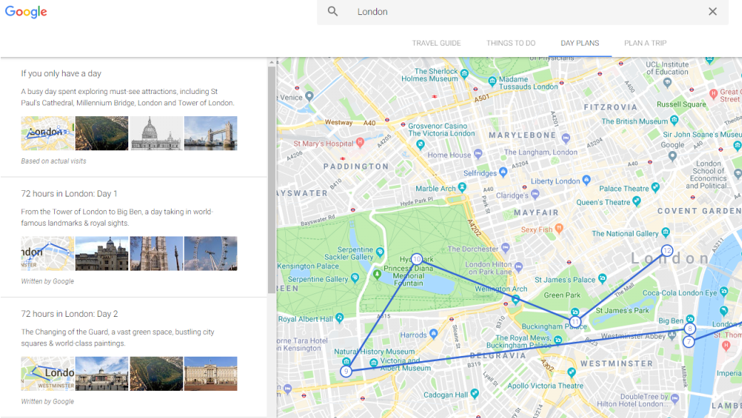 The day plan section really intrigued me because this section is made up from data created by actual human visitors, that Google has tracked via the Maps app on phones to generate different types of day plans, ranging from 1 to 3 days.