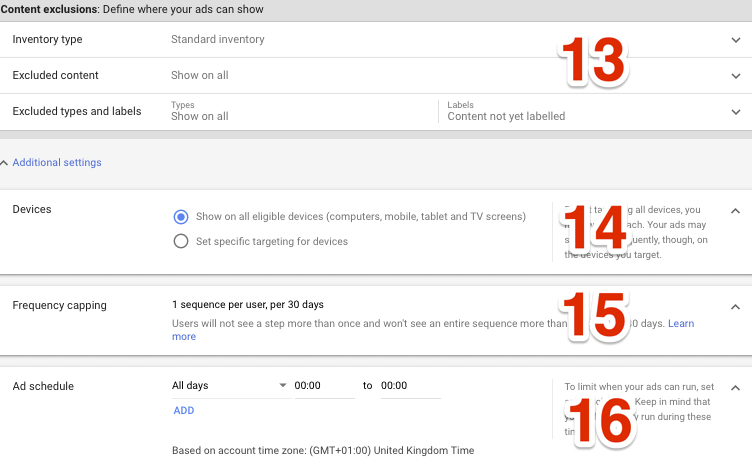 8. You can’t change anything here as the sequencing ads are only allowed to run on YouTube videos, so don’t need to worry about anything here.