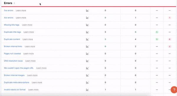Again, this report is an excellent way to track the progress of your SEO campaigns or website repairs, especially if you’re addressing a specific issue on your site. The metrics you can measure in this graph are broken down into four categories: General, Errors, Warnings, and Notices. Click on any to add them to your graph, and click again to deselect them from the legend and remove them.