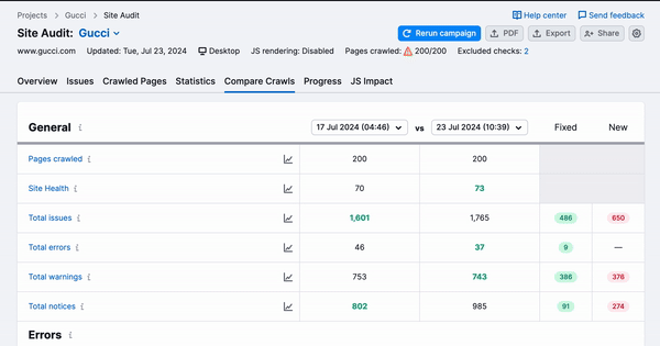 If you’re planning on monitoring the progress of your website’s health over a period of time, you should use the Compare Crawls and Progress tabs in Site Audit. These reports give you the ability to follow which errors, warnings, and notices on your site have been fixed and if any new issues have appeared over time.