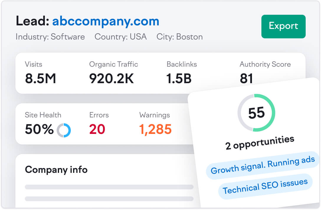 • Measure leads’ potential by looking at their profiles in detail, including their marketing, analytics, and website development tools, as well as website health and traffic insights.